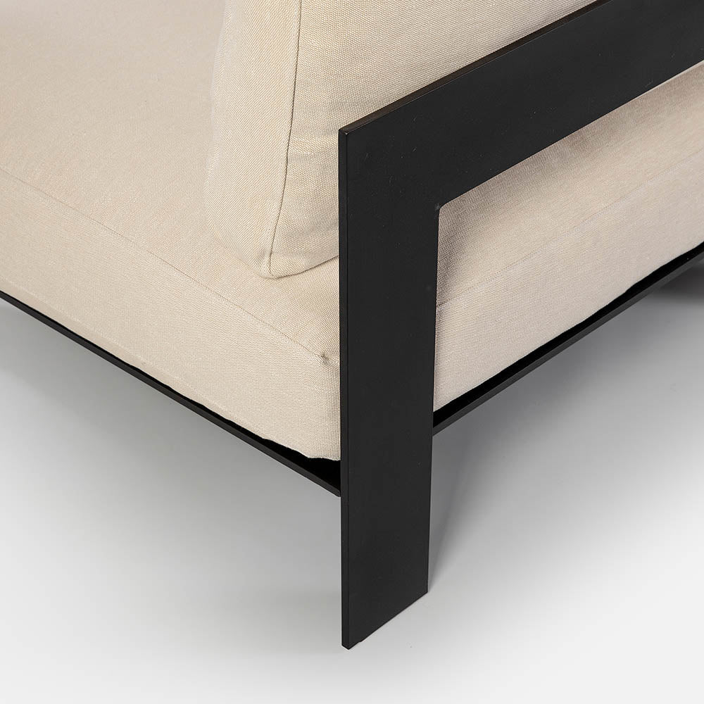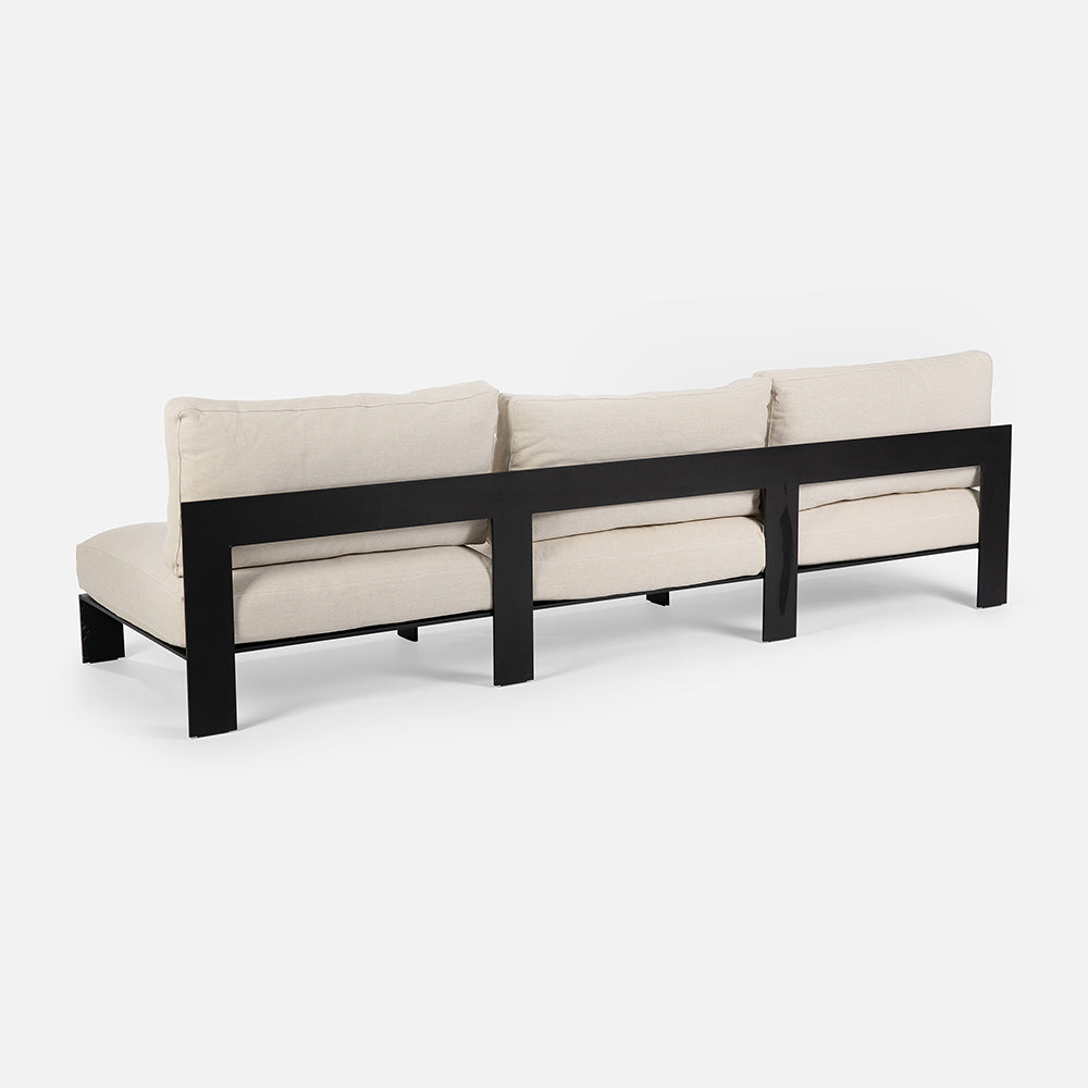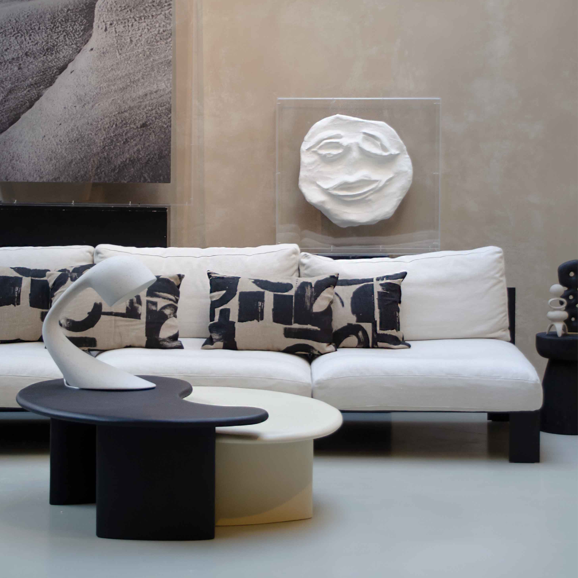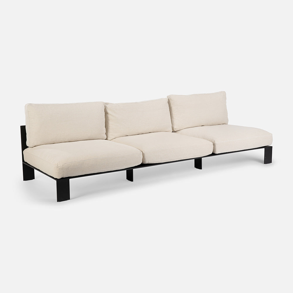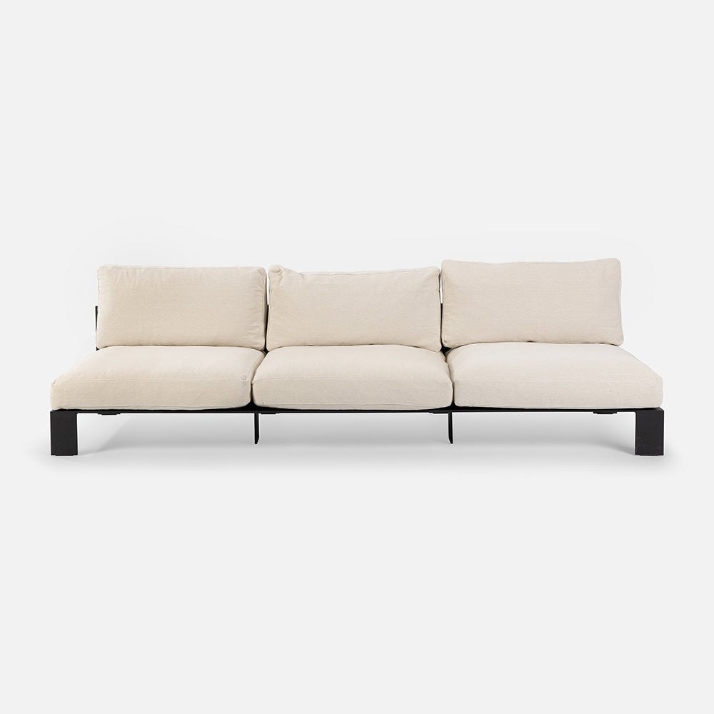 Bea Mombaers' for Serax sofa collection consists of a one-seater, a two-seater, a three-seater and a footstool in the same size as the one-seater. All models are produced in black aluminum for better maneuverability and equipped with soft cushions available in an indoor and outdoor version. By combining and configuring the various elements, you can create your own seating island without any restrictions.