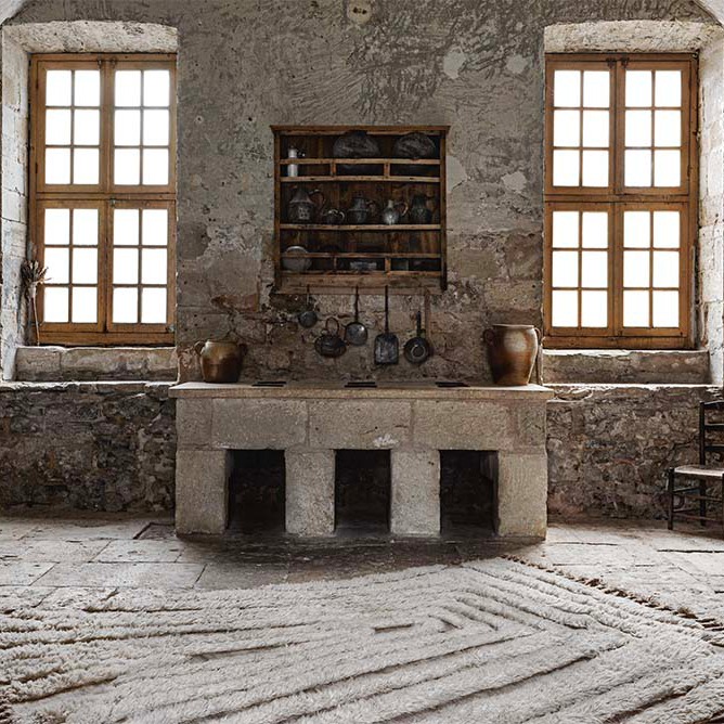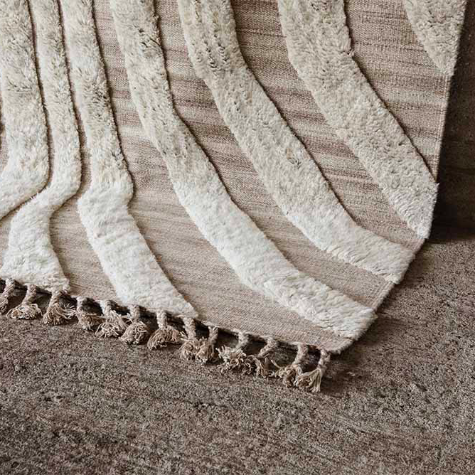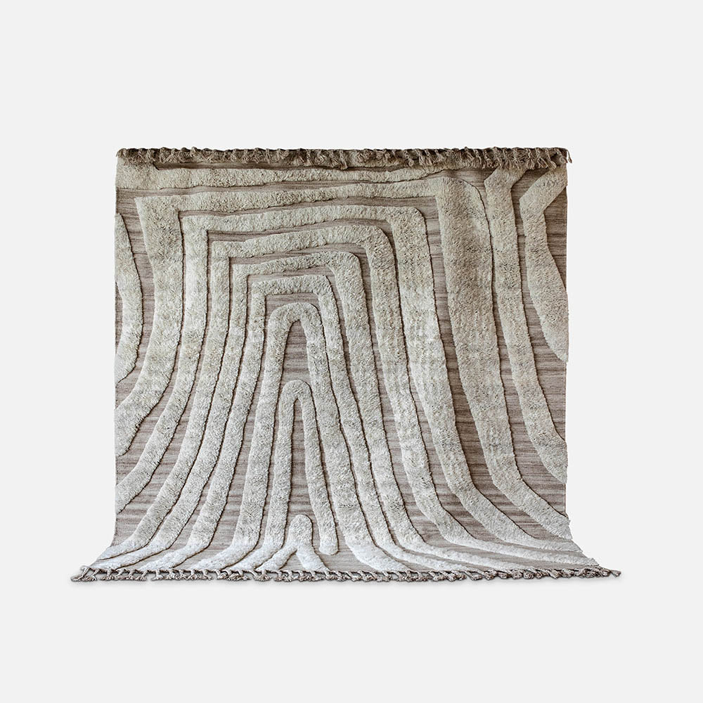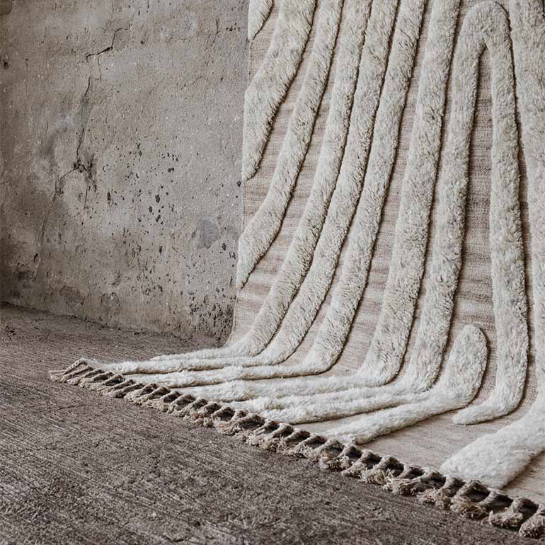 No.02 is a decorative hand-knotted rug in natural wool. The soft irregular pattern creates a vivid and intriguing feel. The rug is in 100% natural and unbleached wool in a soft off-white. A long fringe edge elevates the end line and adds an arty and ethnic detail.