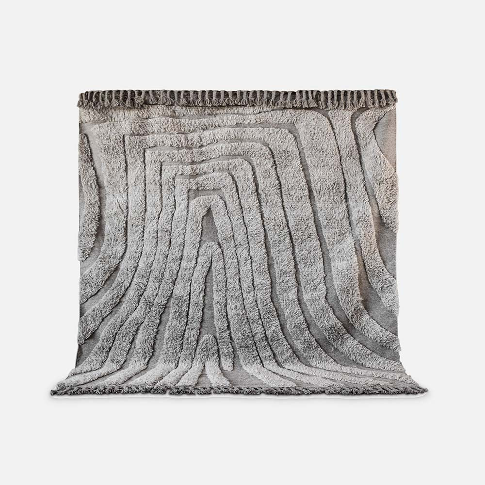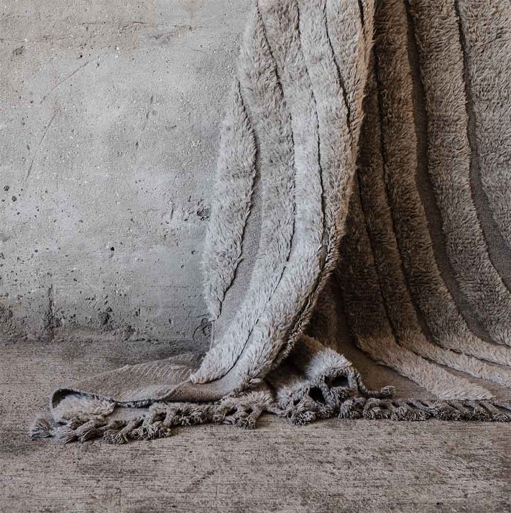 No.04 is a decorative hand-knotted pile in natural wool. The soft irregular pattern creates a vivid and intriguing feel. The rug is in 100% natural and un bleached New Zeeland wool in a dark mole. A long fringe edge elevates the end line and adds an arty and ethnic detail.