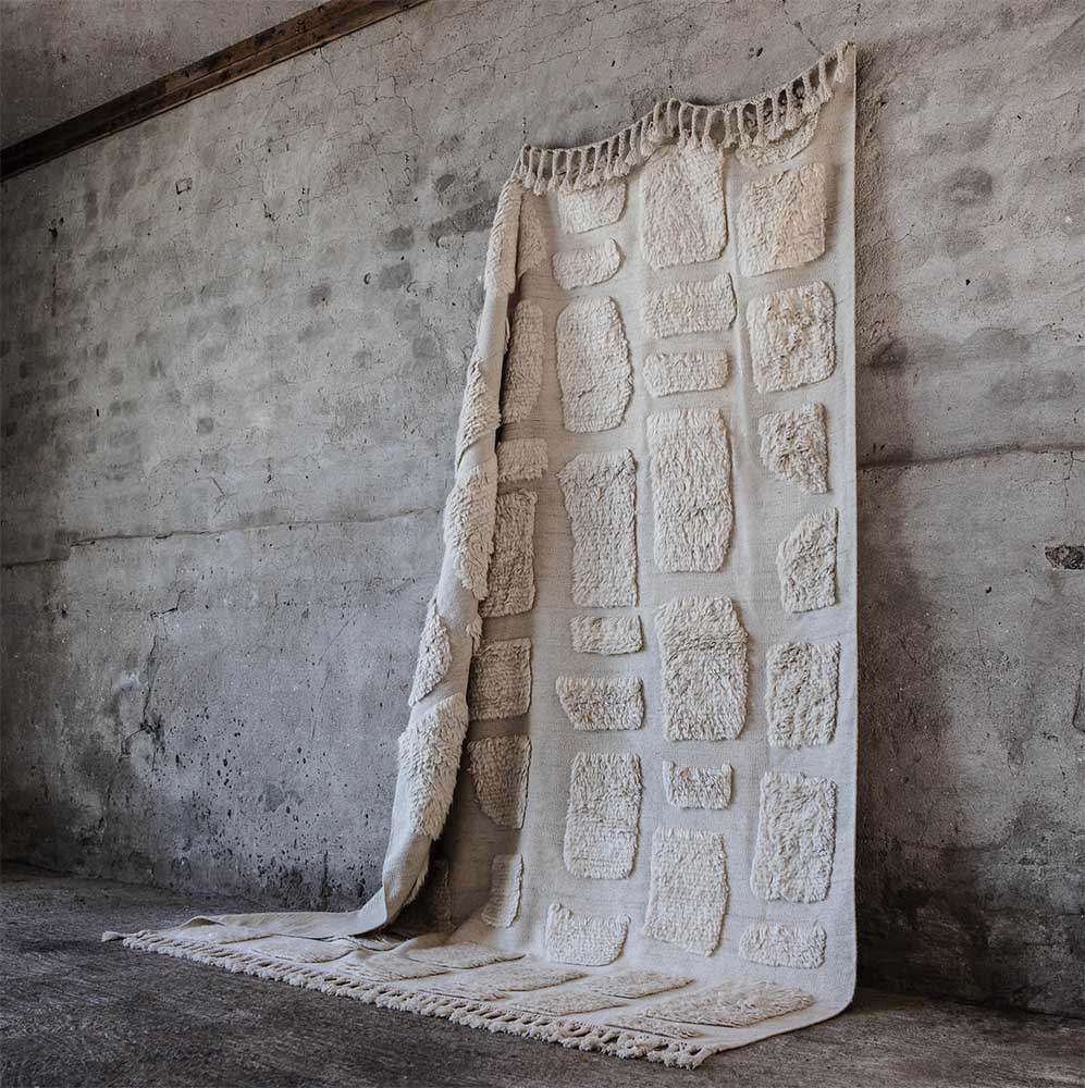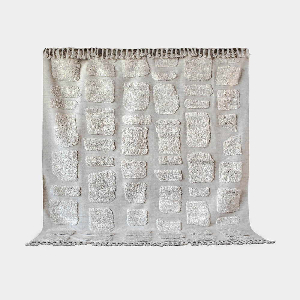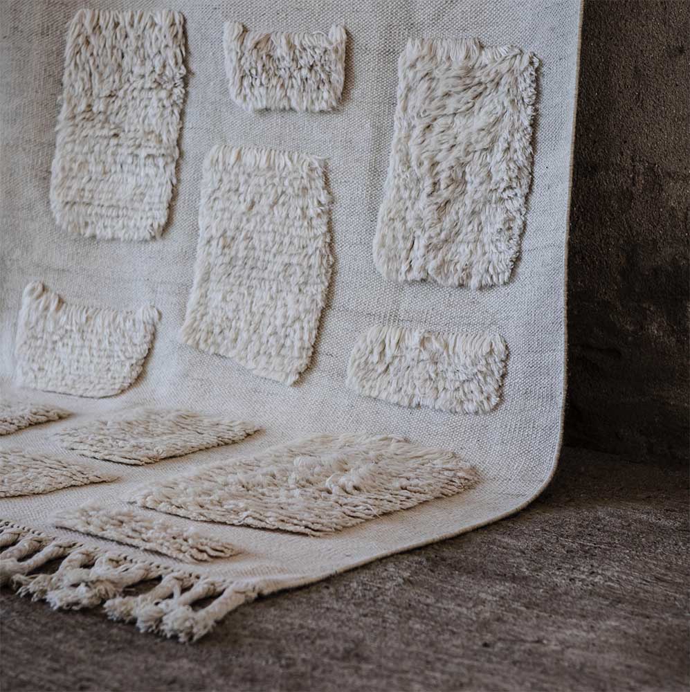 No.05 is a contemporary yet timeless hand-knotted rug in natural wool. The soft fields of shaggy wool pattern create an organic and bohemian vibe to this signature piece. The rug is in 100% natural and unbleached wool in a soft off white. A braided chunky fringe edge elevates the end line and adds an arty and ethnic detail.