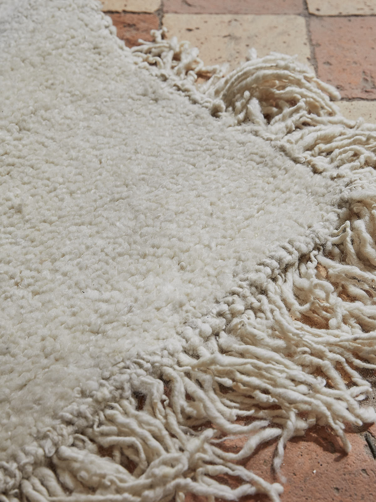 No.10 is a heavy and ristic rug in a luxury chunky wool woven in a classic basket weave contruction. The bold and exagurated yarn runs through the entire rug and end up with fringes along all sides with the same yarn.
