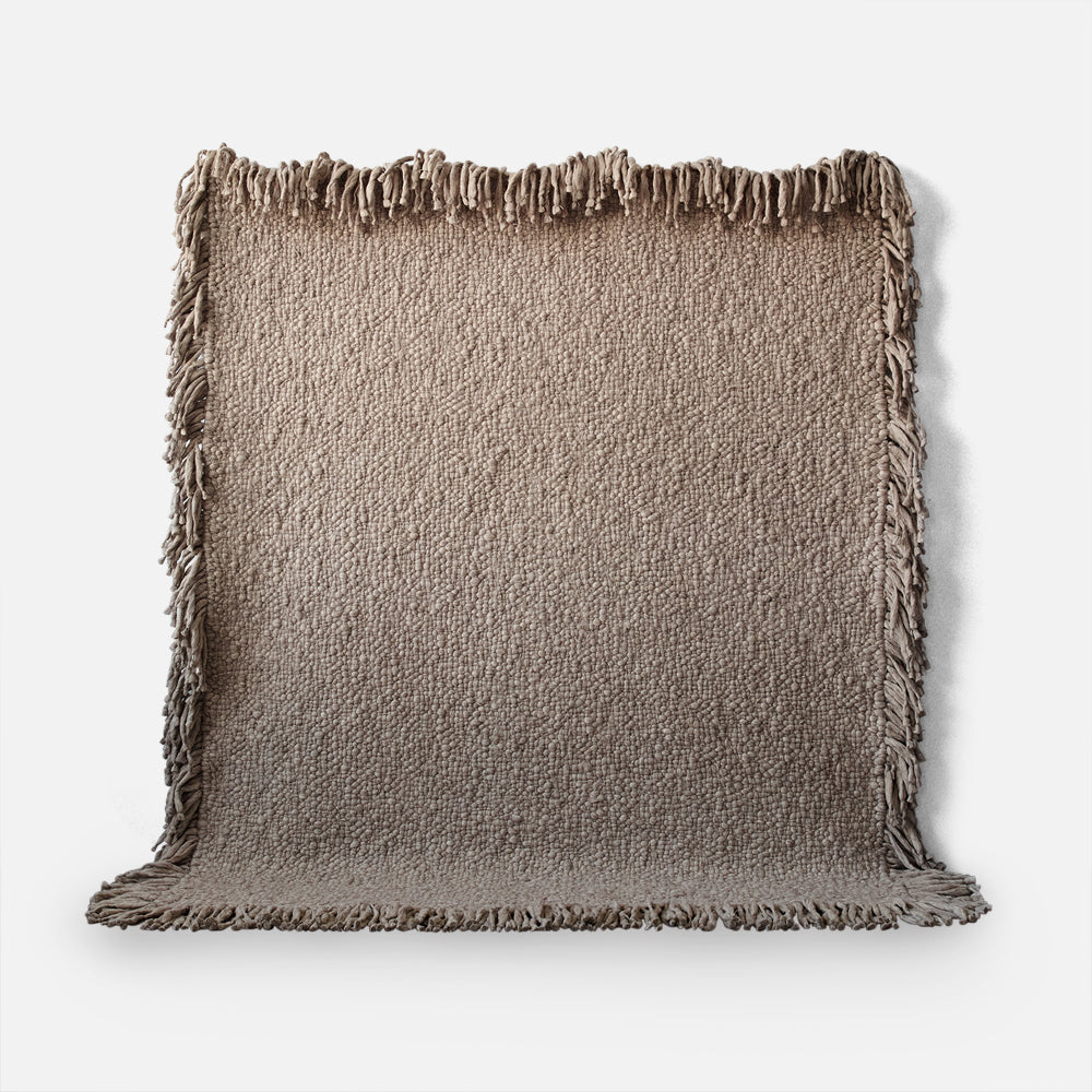 No.11 is a heavy and compact rug in luxury chunky wool cut in a short pile. Bold and curly handspun slub yarn frames the edges and creates a bohemian and soft vibe to this elegant rug in chalky off-white shade.