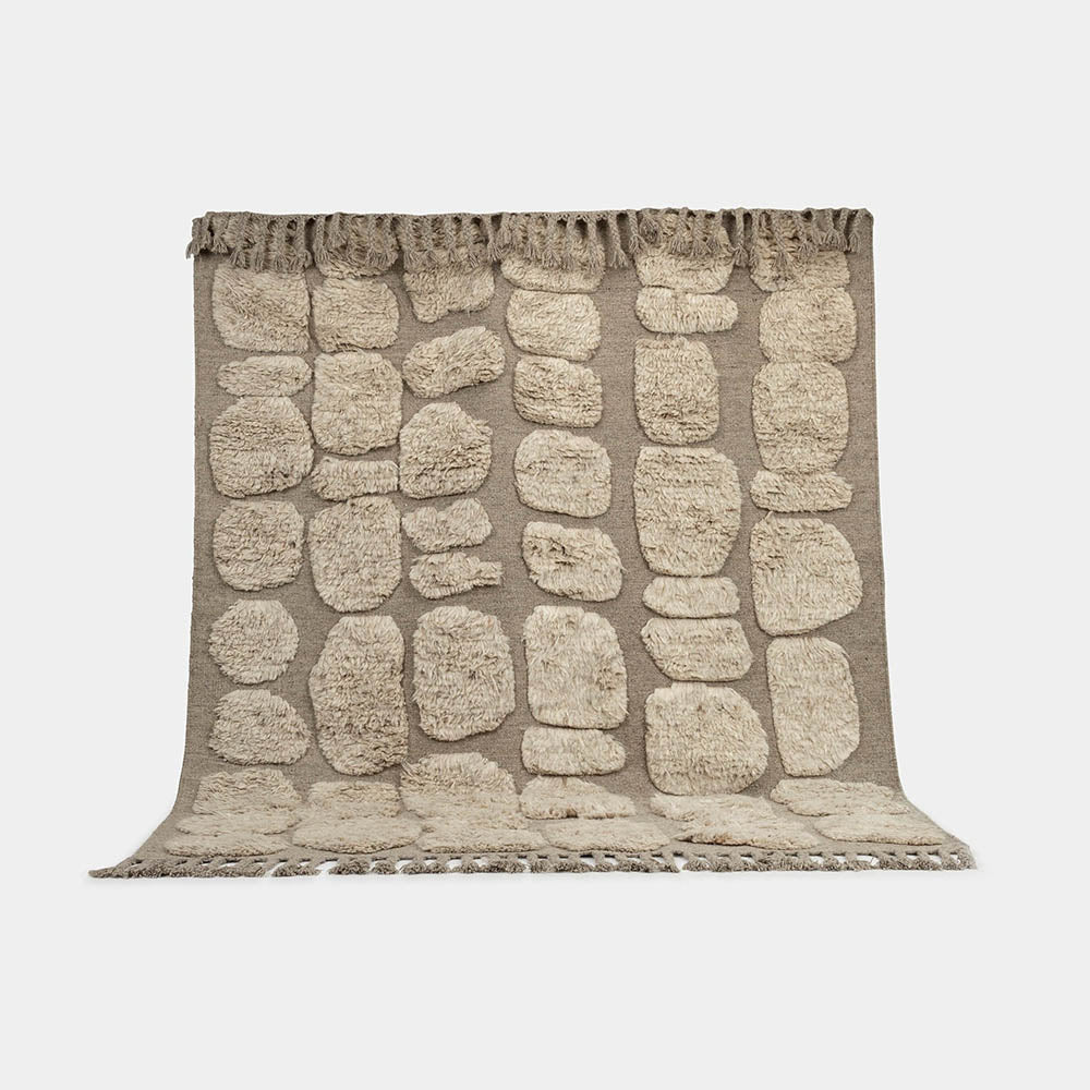 No.03 is a contemporary yet timeless hand-knotted rug in natural wool. The soft fields of shaggy wool pattern creates an organic and bohemian vibe to this signature piece. The rug is in 100% natural and unbleached wool in a soft grey/beige. A braided chunky fringe edge elevates the end line and adds an arty and ethnic detail.