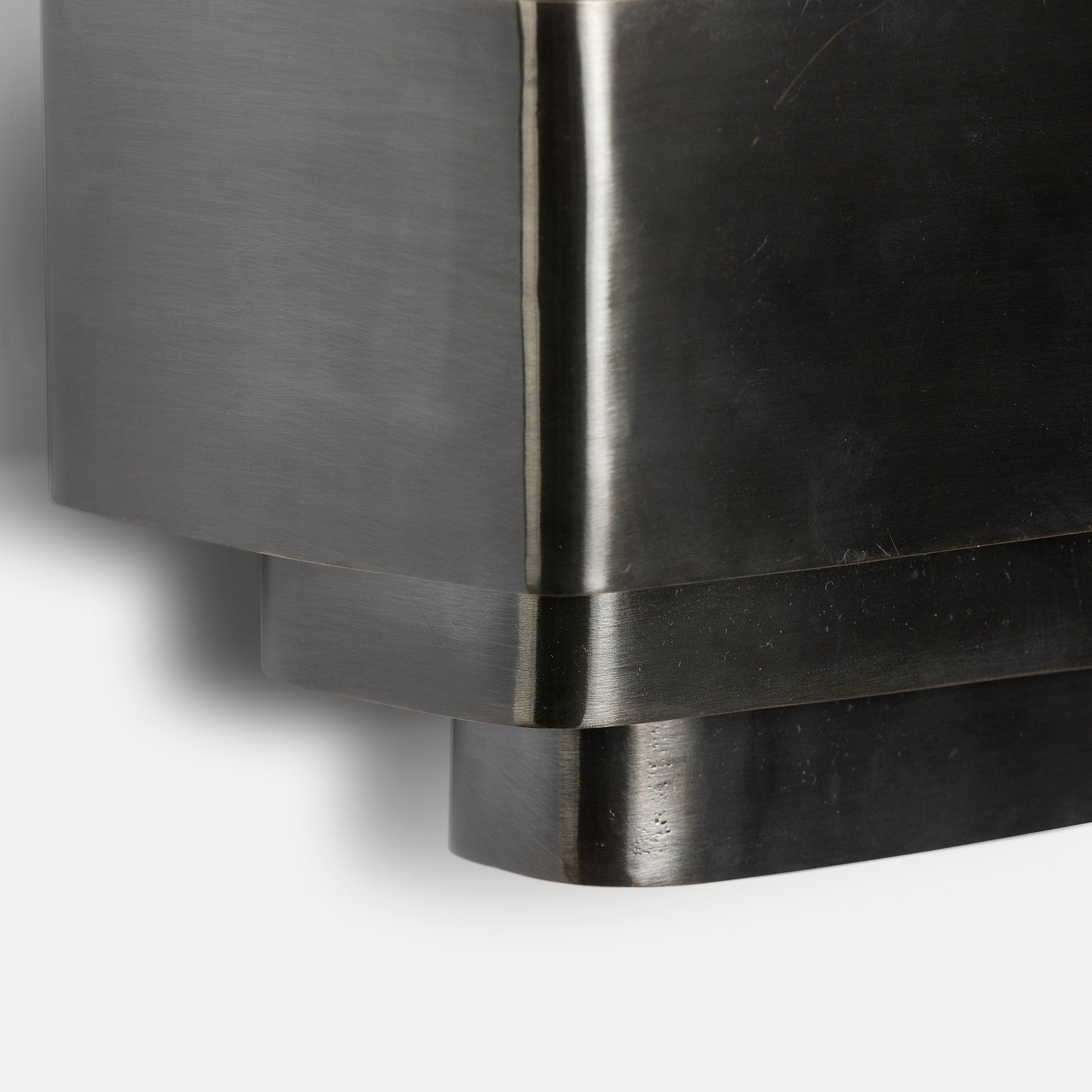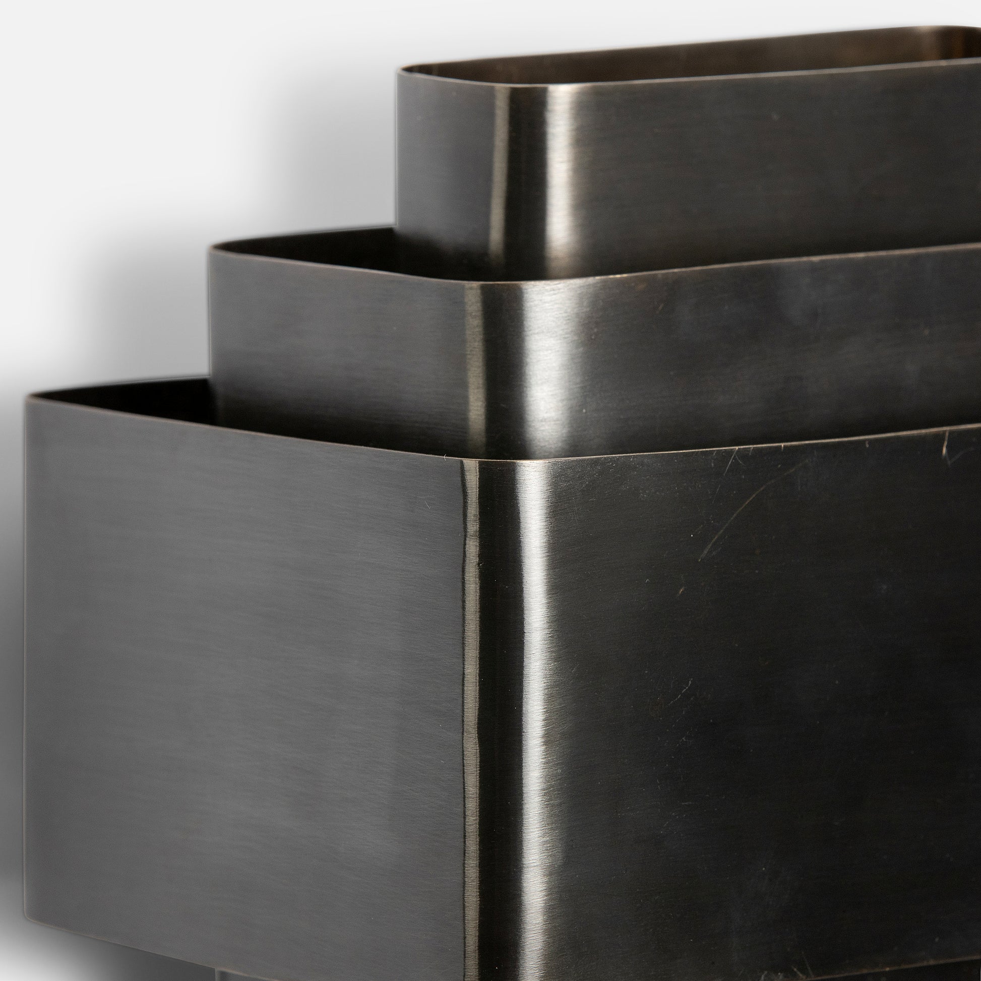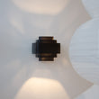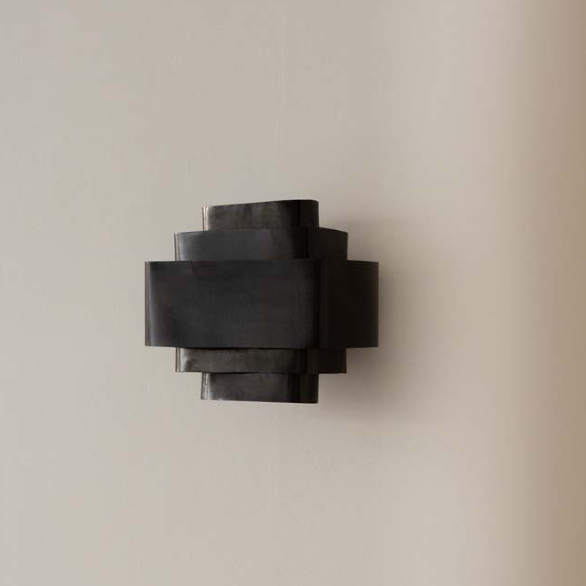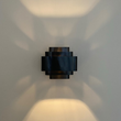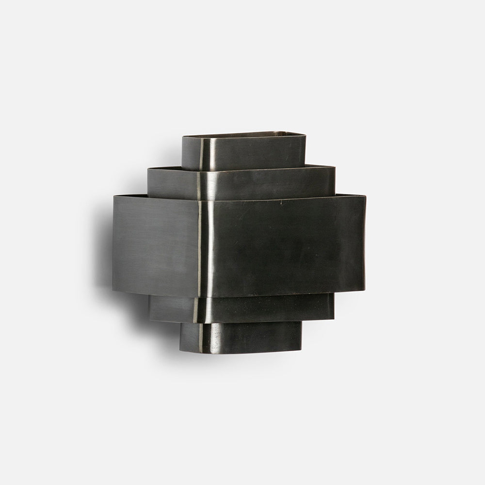Handcrafted wall sconce made out of blackened brass. The light shines out of the bottom and the top of the lamp, causing the light to reflect onto the wall in two directions. Ideal over stairs, in the kitchen or along a hallway.
